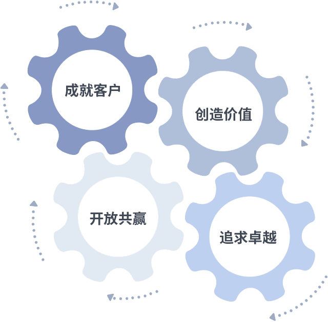 成就客户是一切决策的出发点,,,,创造价值是衡量所有工作的标准,,,追求卓越是我们做事做人的态度,,,开放共赢是我们的格局也是最终的结果。。。。价值观的齿轮环环相扣,,,,推动着组织里的每个人不断向前。。。。